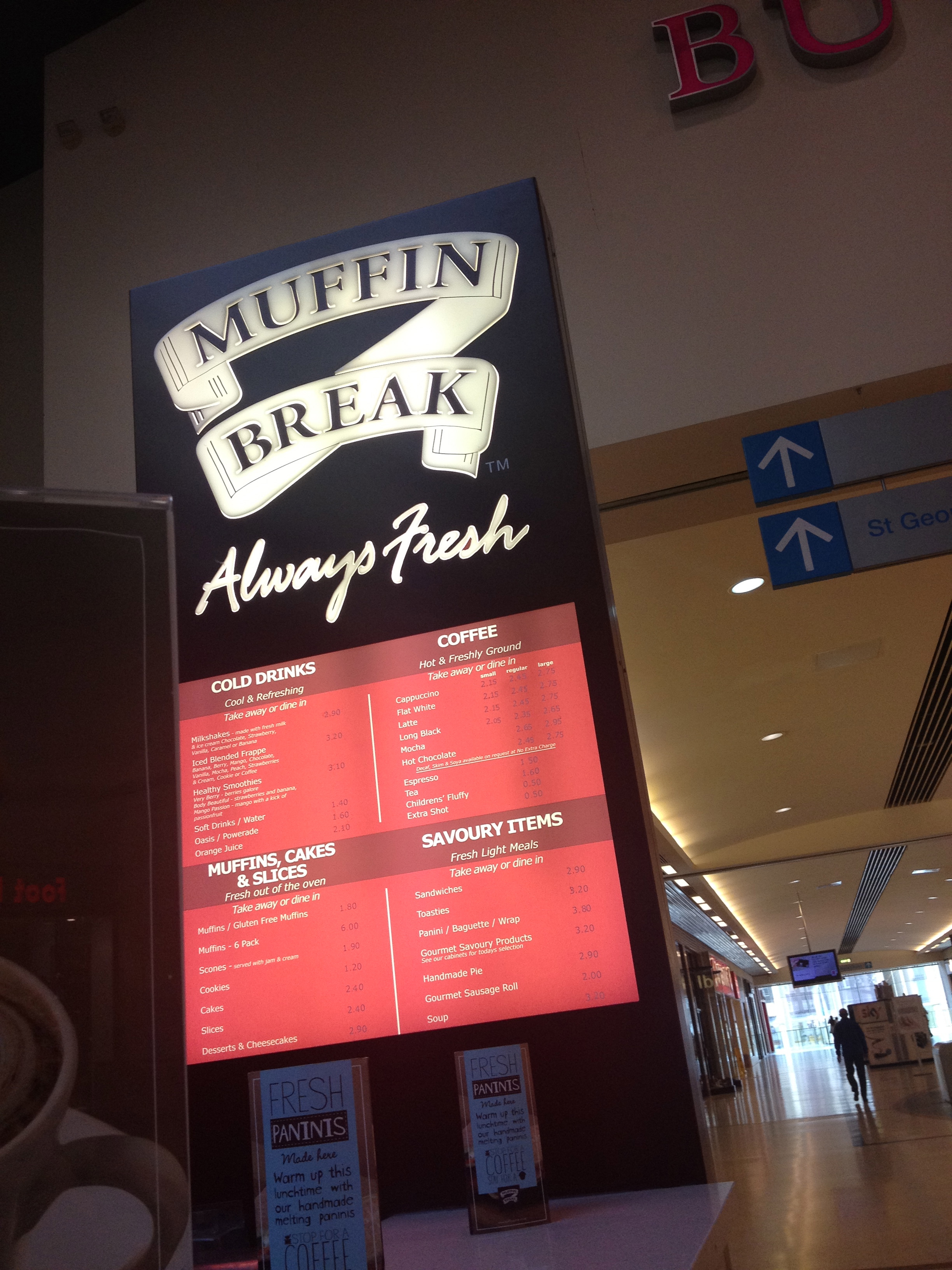 The other day I was stopped by a security guard in the Arndale and told that I am not allowed to take photos of the centre by order of the management. (I was taking a photo of the Muffin Break sign, not on its aesthetic merits, but because I was thinking I might write a review of the place in a forthcoming post. The irony of this is not lost on me.)